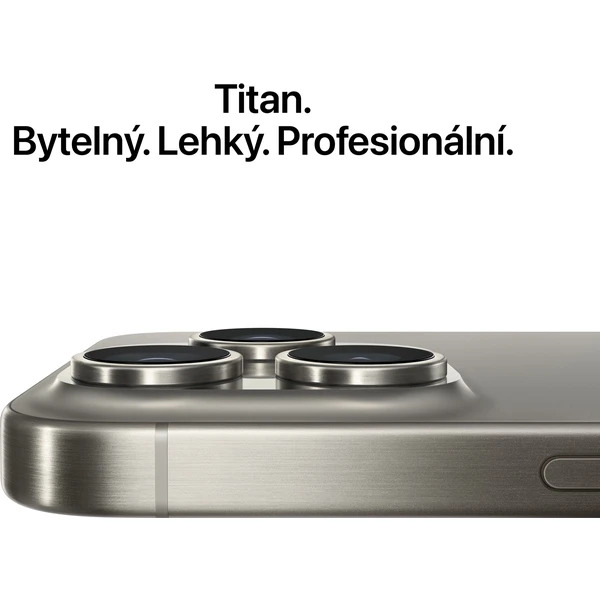 Smartfón Apple iPhone 15 Pro sa vyznačuje konštrukciou z leteckého titánu v prírodnej farbe, pohlcujúcim 6,1" Super Retina XDR OLED displejom s ProMotion 120 Hz obnovovacou frekvenciou a pevnou ochranou Ceramic Shield, ultrarýchlym čipom A17 Pro, trojitým zadným fotoaparátom s rozlíšením 48 MPx a portom USB-C.