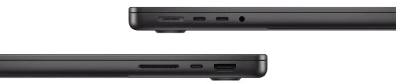 MacBook Pro má solídnu paletu portov na pripojenie vysokorýchlostných periférií, používanie monitorov s vysokým rozlíšením aj načítanie dát rovno z SDXC kariet. Modely s čipmi M4 Pro a M4 Max teraz majú Thunderbolt 5, ktorý ponúka prenosové rýchlosti až 120 Gb/s. MacBook Pro tiež podporuje Wi-Fi 6E a Bluetooth 5.3 na pripojenie k internetu a bezdrôtovým zariadeniam.